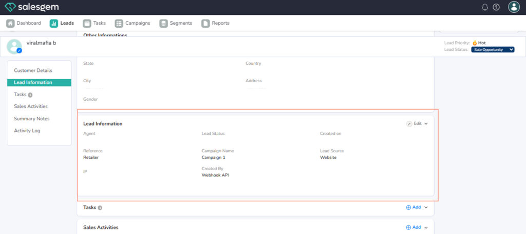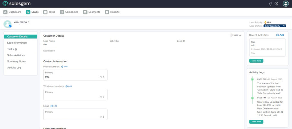 The Detailed Lead View in Salesgem provides a complete profile of each lead, bringing together all important information in one place. When you open a lead, you can see their basic details such as name, email, phone number, and company information, along with any custom fields your organization has added. The view also displays the lead’s status, source, and the user currently assigned to handle it, making it easy to track ownership and progress.