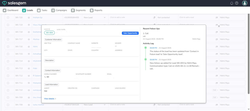 Below this, you’ll find a timeline of all activities linked to the lead, including calls, emails, notes, and tasks, ensuring that every interaction is documented for better follow-up. If campaigns or segments are connected, those details will also appear here. The Detailed Lead View is designed to give sales teams a 360-degree understanding of each prospect, helping them manage communication, track engagement, and move leads smoothly through the funnel.