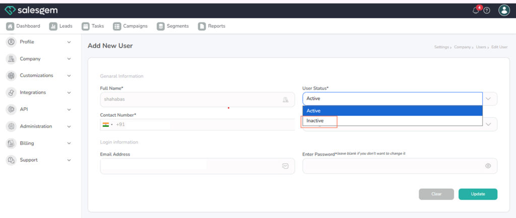 You can activate or deactivate a user in Salesgem from the Edit User page under Company Settings.
