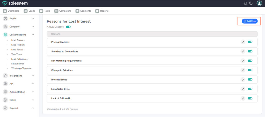 You can add or edit lead status change reasons in Salesgem from Settings → Lead Customizations → Status Change Reasons. These reasons help track why a lead moved from one status to another, giving your team better clarity and insights in reports.