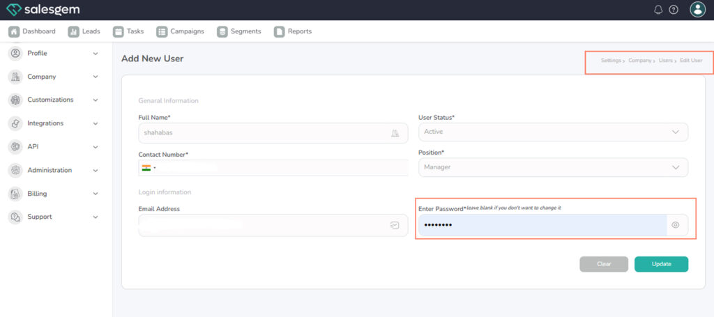Admins can change or reset a user’s password directly from the Edit User page.