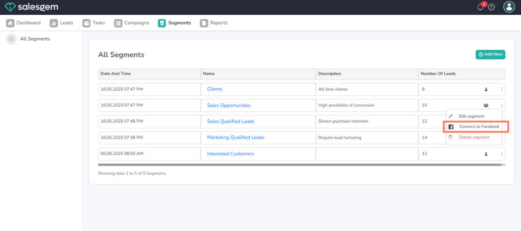 You can connect a Salesgem segment to Facebook Audiences by selecting your segment, clicking the three-dot menu, and choosing the “Connect to Facebook” option for direct audience syncing.