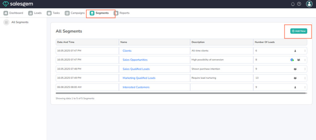 In Salesgem, you can create and manage segments by going to the Segments section, adding a new segment, filling in the required details, and saving it. This allows you to group leads or contacts based on specific criteria for targeted marketing.